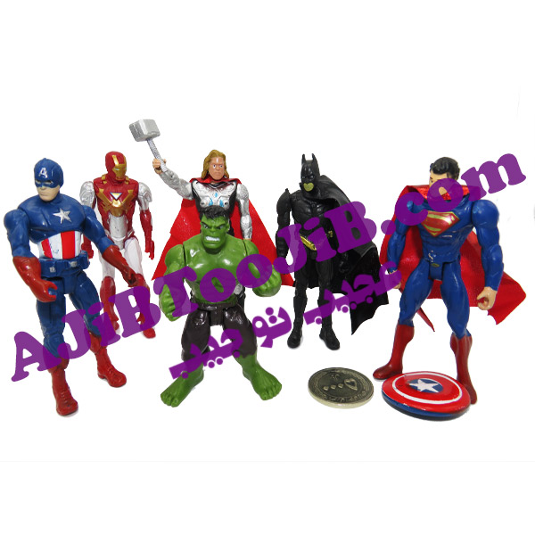 نام کاراکترهای اکشن فیگور ابرقهرمانان: سوپرمن، بتمن، تور، کاپیتان آمریکا، آیرون من، هالک نیرومند