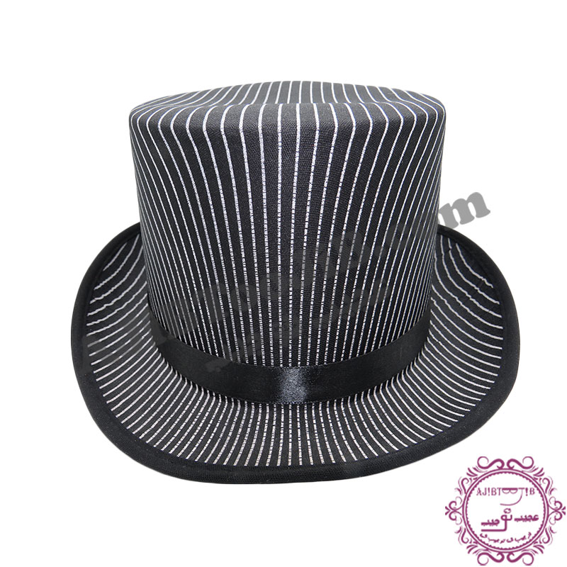 کلاه مشکی با خط های سفید رنگ که بسیار شکیل و رسمی بوده و مناسب اجرای شعبده در محافل رسمی می باشد (با رویه پارچه ای و برای همه سنین)